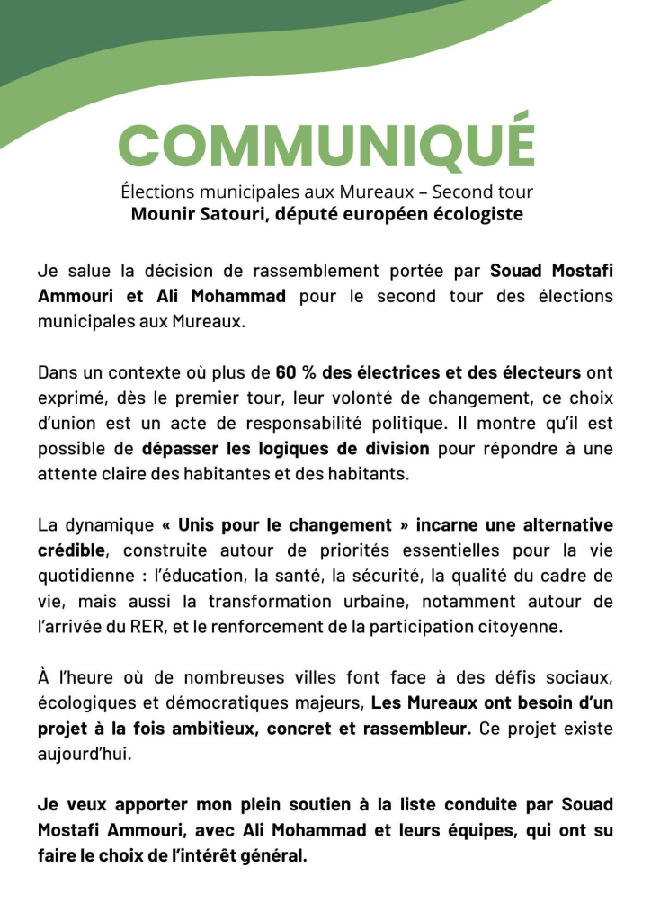Le communiqué rappelle qu’au premier tour, plus de 60 % des électeurs ont exprimé leur volonté de voir évoluer la situation locale. Dans ce contexte, l’union entre les deux candidats apparaît, selon Mounir Satouri, comme une réponse claire à cette attente.